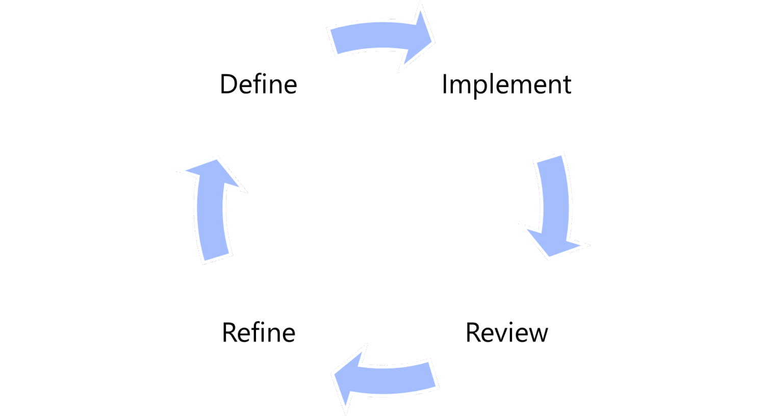 We often describe this as a cycle: define, implement, review, refine, repeated consistently as circumstances change and evolve.
