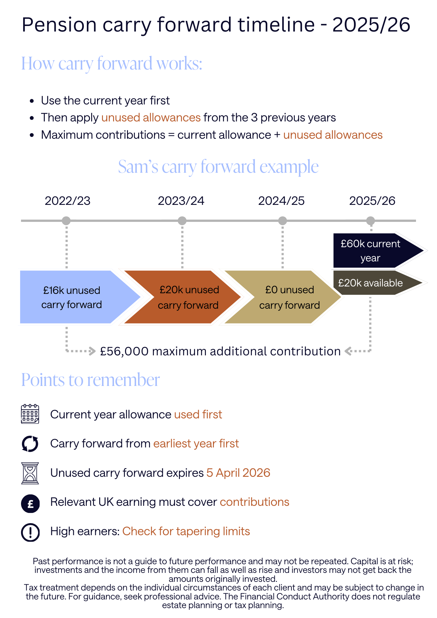 Where personal contributions are being made, the individual must have relevant UK earnings at least equal to the gross contribution amount in the current tax year in order to receive tax relief. In Sam’s case, this would require earnings of at least £96,000 in 2025/26.